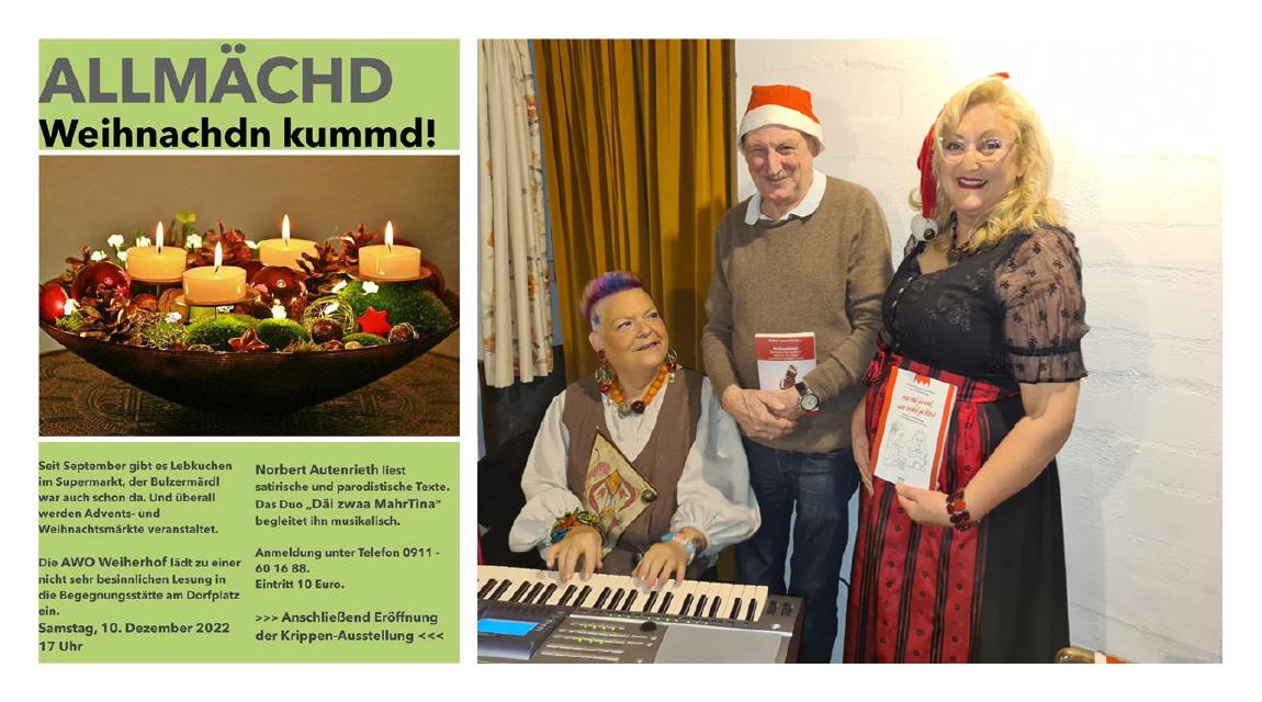Der AWO Ortsvereins Weiherhof bedankt sich für das tolle Adventsprogramm! Es war super lustig und für uns alle ein absolut rundum gelungener Abend, auch in Verbindung mit der Autorenlesung. Eine willkommene Abwechslung zu den normalen Weihnachtsveranstaltungen. Wir hoffen, Sie bald wieder bei uns begrüßen zu dürfen - am besten schon im nächsten Sommer!