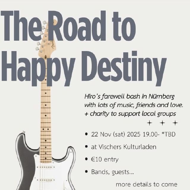 The Road to Happy Destiny – Ein Eric Clapton Tribute Konzert, akustisch und elektrisch. Hiro Kameis Abschiedsparty in Nürnberg mit Musik, Freunden und Liebe. Zudem eine Charity-Aktion zur Unterstützung lokaler Initiativen (der Hut geht rum).