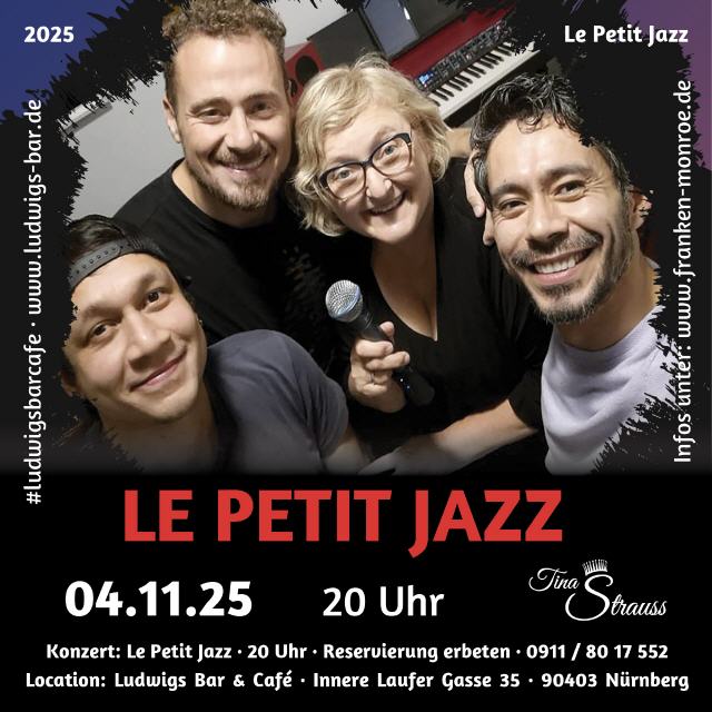 Erleben Sie einen entspannten Abend mit „Le Petit Jazz“ – einer Band, die mit sanften Jazzstandards, gefühlvollem Gesang, Klavier und Kontrabass für eine angenehme Atmosphäre sorgt. Genießen Sie musikalische Leichtigkeit und stilvolle Interpretationen in gemütlichem Ambiente im Ludwigs. Reservierung erbeten unter Tel. 0911 / 80 17 552